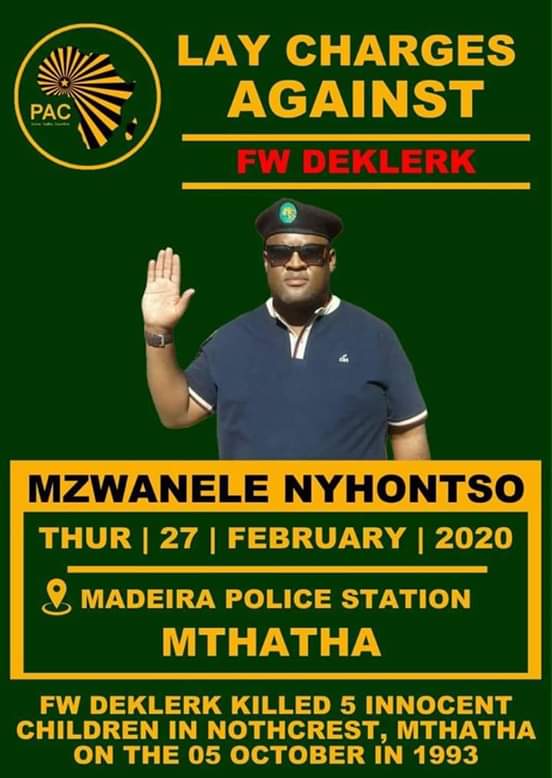 The Pan Africanist Congress of Azania (PAC), led by its President will open a criminal case against the former Apartheid President, Mr FW de Klerk on 27 February 2020, in eMthatha, Eastern Cape Province and/alternatively demand answers on the progress made regarding the investigation of the criminal act committed against Mpedulo family by this despot leader.